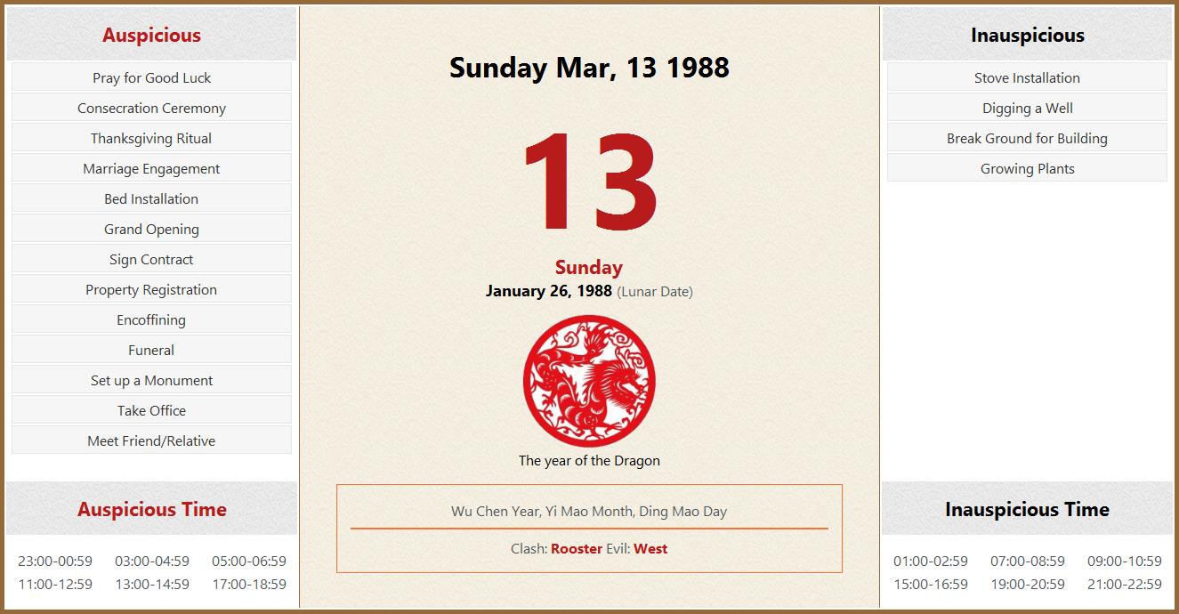 March 13 1988 Almanac Calendar: Auspicious/Inauspicious Events and