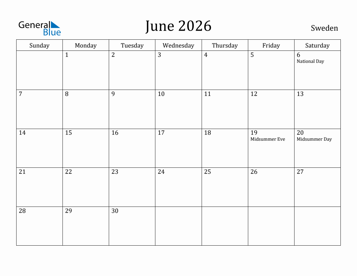 June 2026 Monthly Calendar with Sweden Holidays