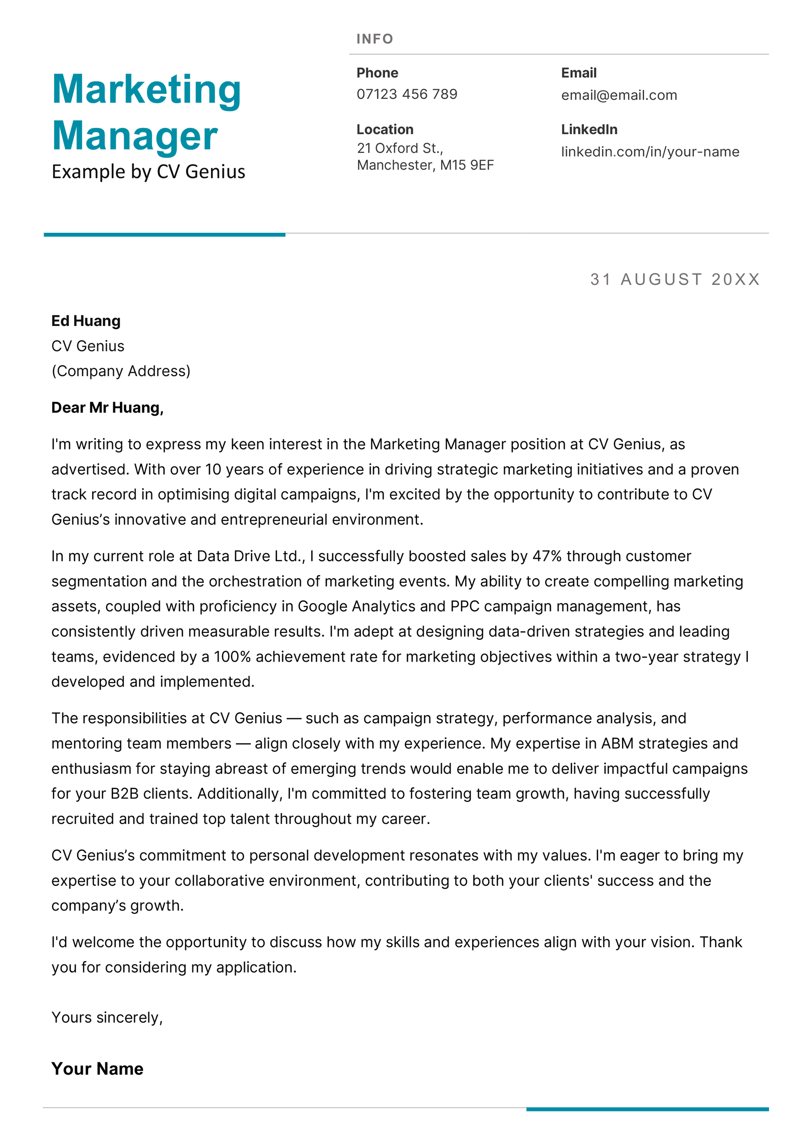 Marketing Manager Cover Letter Examples for UK Market (2025) · Resume io