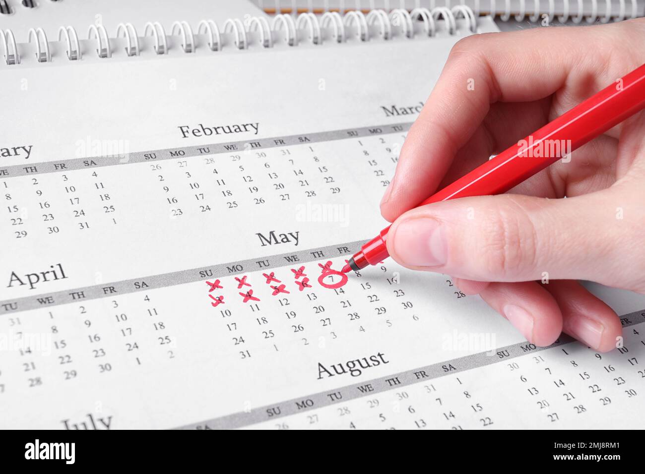 Woman marking date in calendar with red felt pen closeup Stock Photo