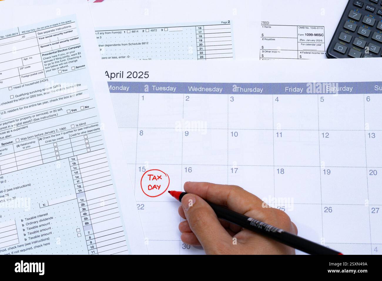 A close up of a hand marking quot Tax Day quot on April 15 2025 in red ink on