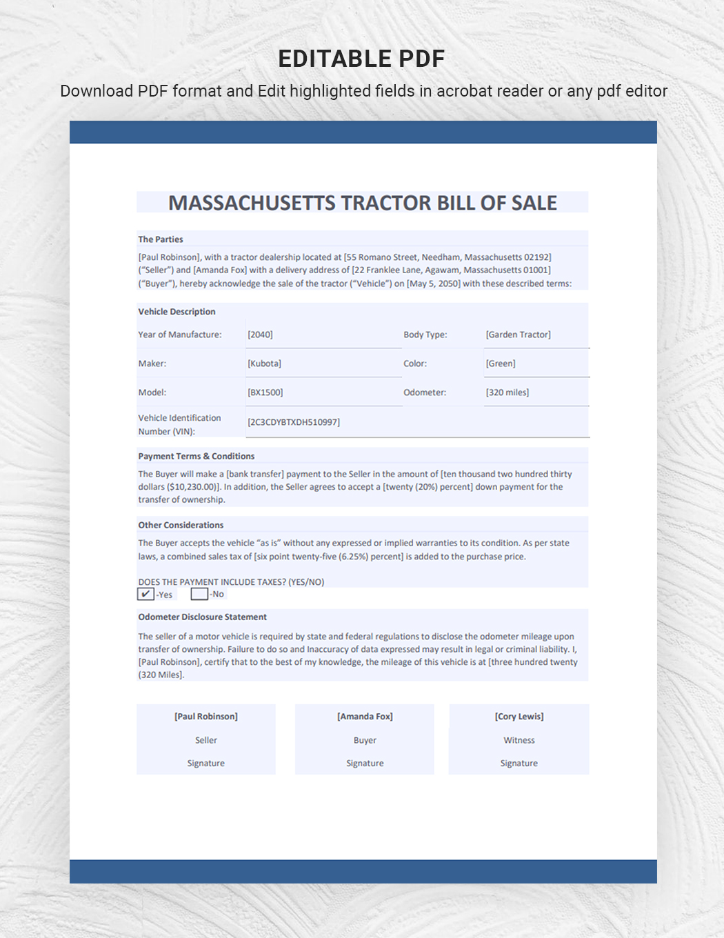 Massachusetts Tractor Bill of Sale Template in PDF Word Google Docs