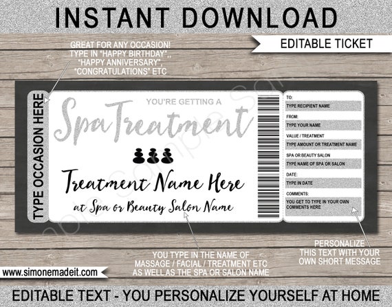 Printable Spa Day Gift Ticket Editable Spa Gift Voucher Custom Spa