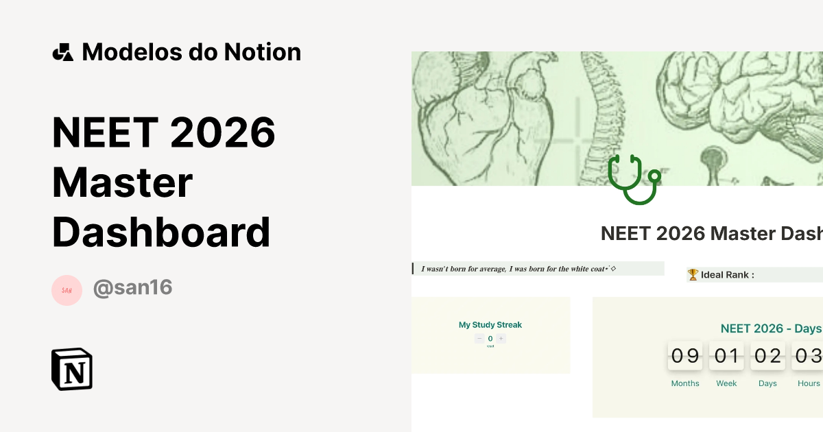 Modelo NEET 2026 Master Dashboard Marketplace do Notion
