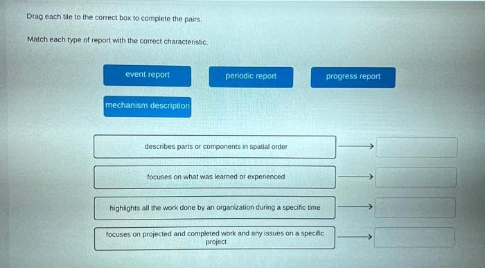 Drag the tiles to the correct boxes Not all tiles will be used Match