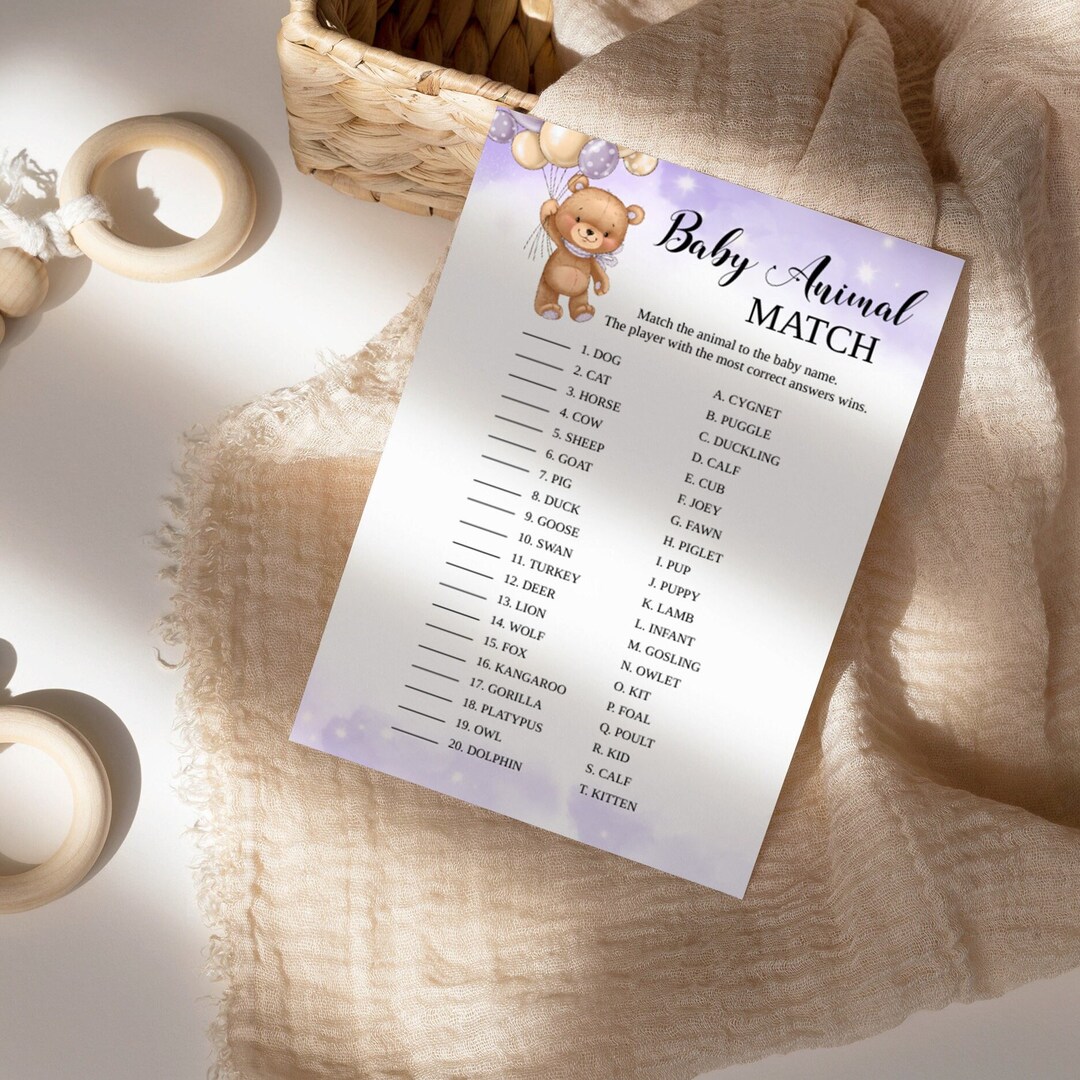 Baby Animal Match Game Template Lavender Teddy Bear Theme Instant