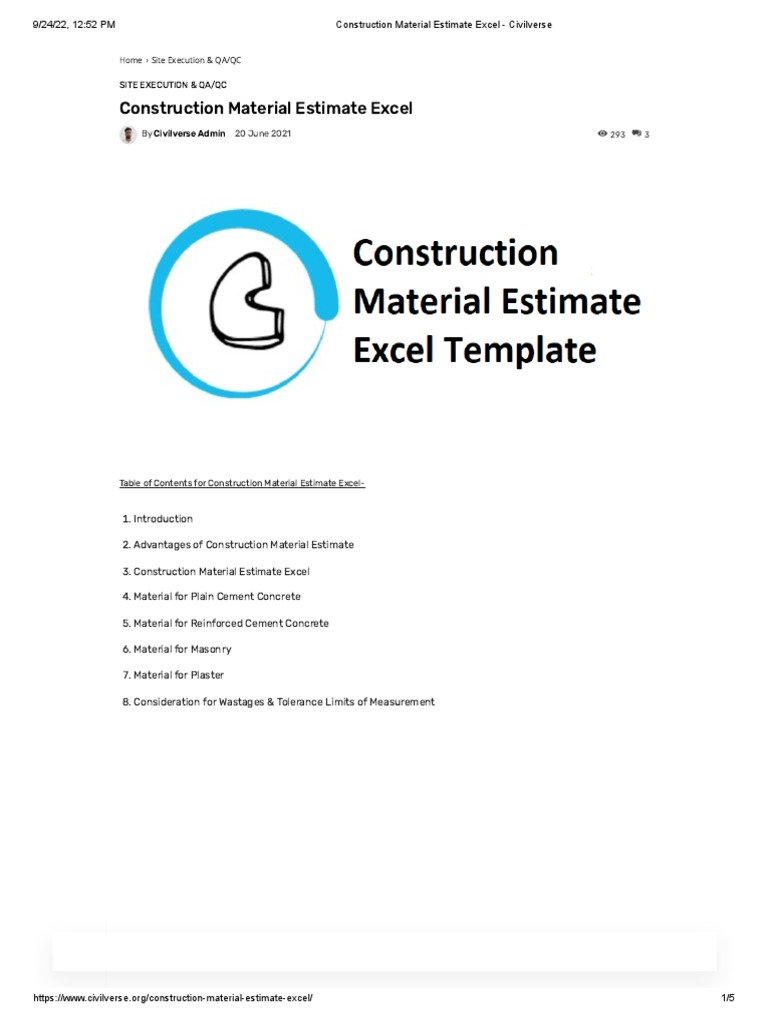 Construction Material Estimate Excel Civilverse PDF Concrete