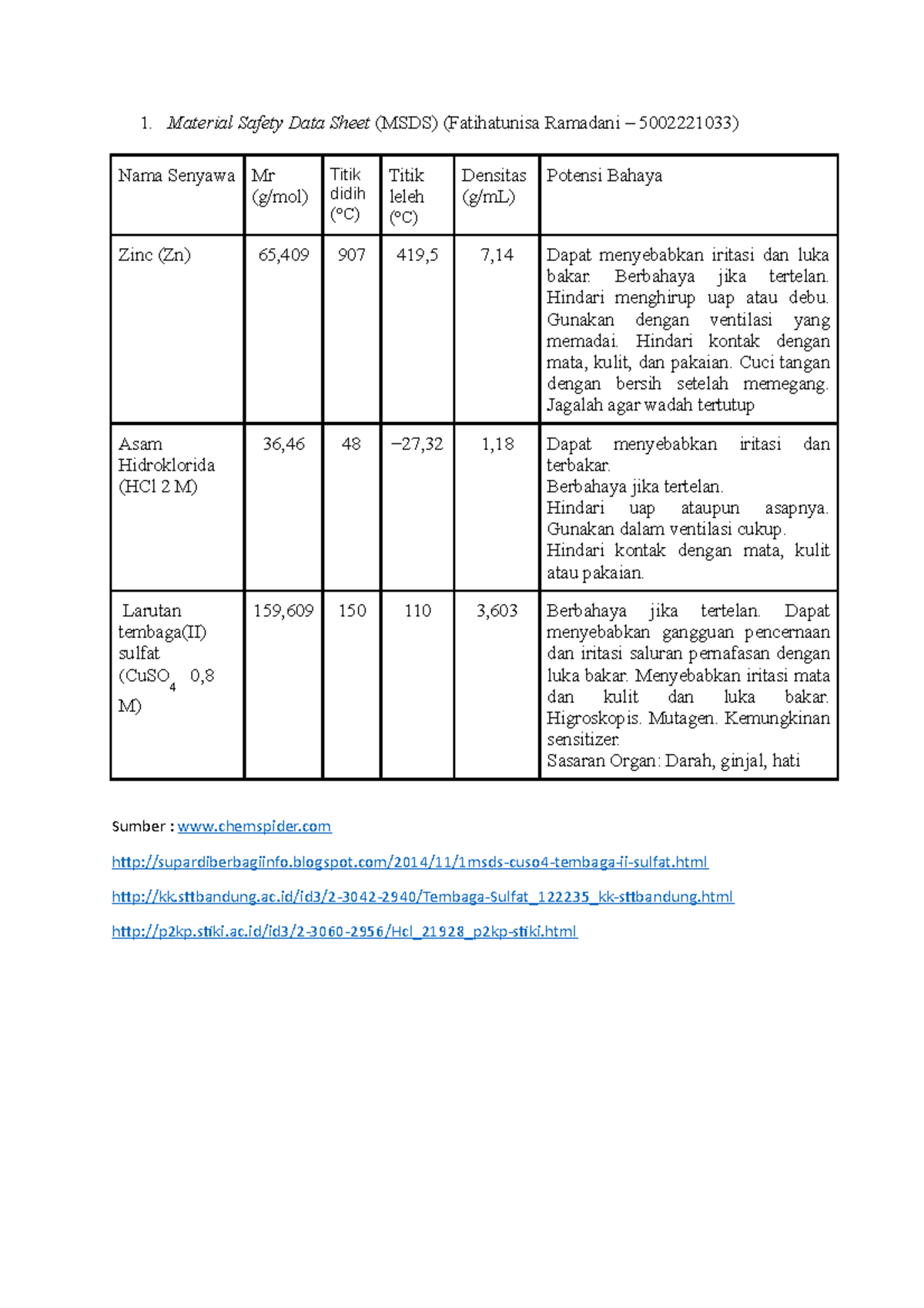 Material Safety Data Sheet (MSDS) Praktikum 1 Zinc HCl CuSO4 Studocu