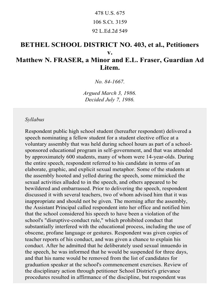 Landmark Supreme Court Cases Bethel School District v Fraser by Alta