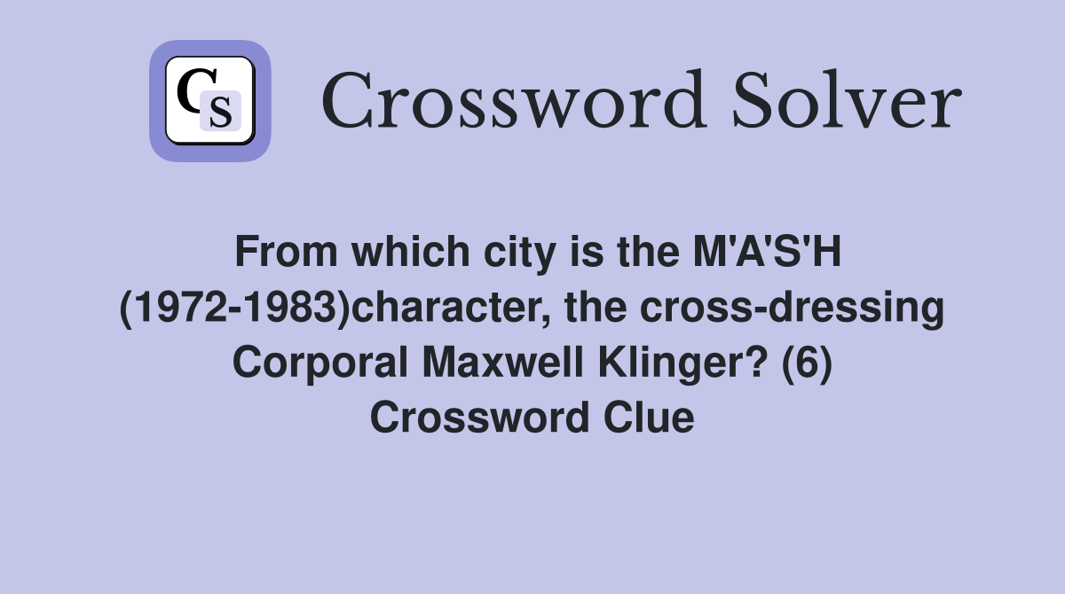 From which city is the M #39 A #39 S #39 H (1972 1983)character the cross dressing