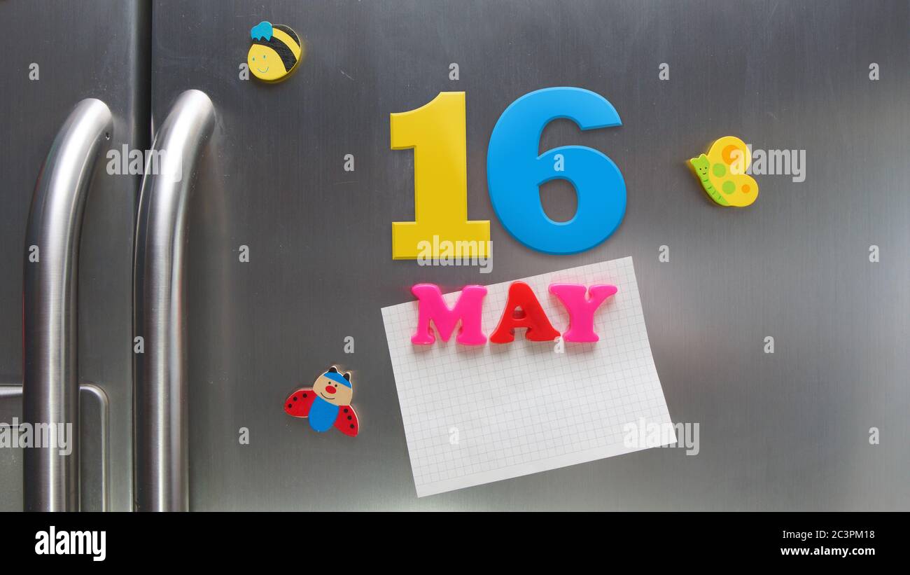 May 16 calendar date made with plastic magnetic letters holding a note