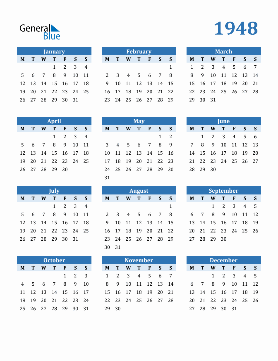 Free 1948 Year Calendar in PDF Word and Excel with Monday Start