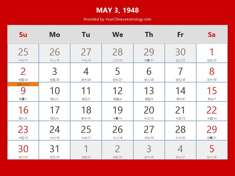 Chinese Calendar May 03 1948: Auspicious Things to Do and Hours Bazi