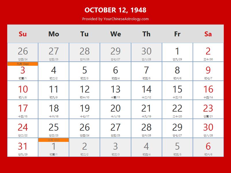 Chinese Calendar Oct 12 1948: Auspicious Things to Do and Hours Bazi