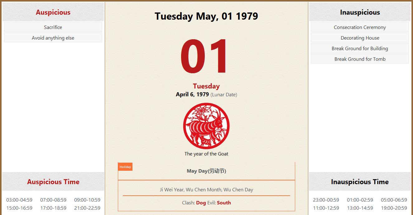 May 01 1979 Almanac Calendar: Auspicious/Inauspicious Events and Time