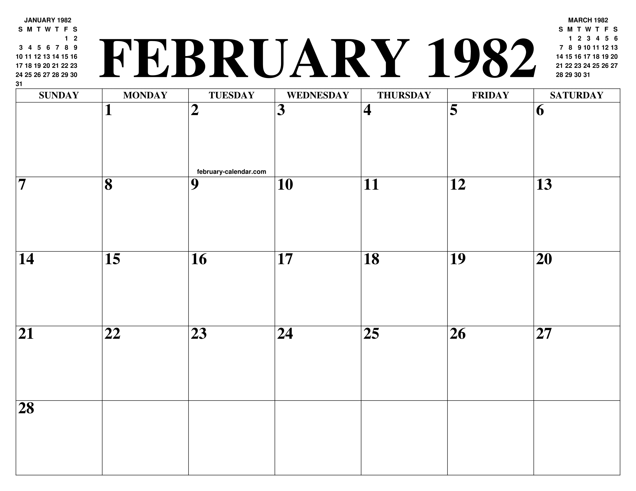 FEBRUARY 1982 CALENDAR OF THE MONTH: FREE PRINTABLE FEBRUARY CALENDAR