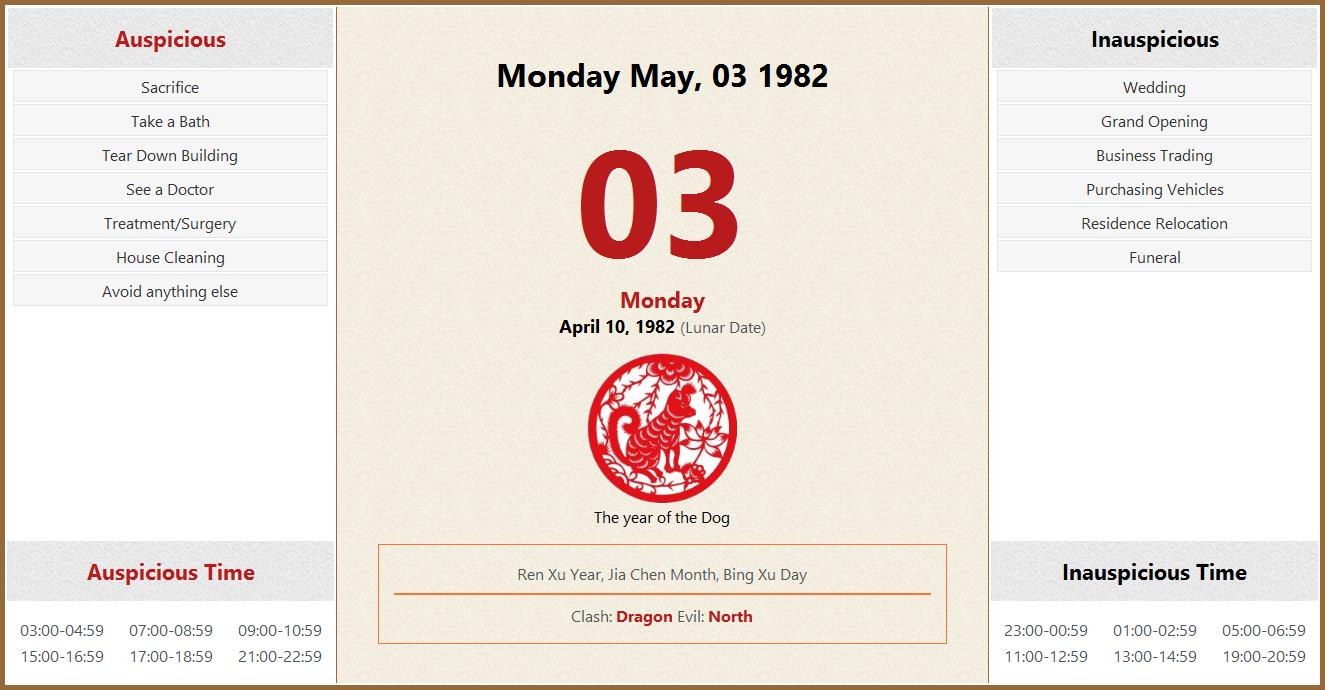 May 03 1982 Almanac Calendar: Auspicious/Inauspicious Events and Time