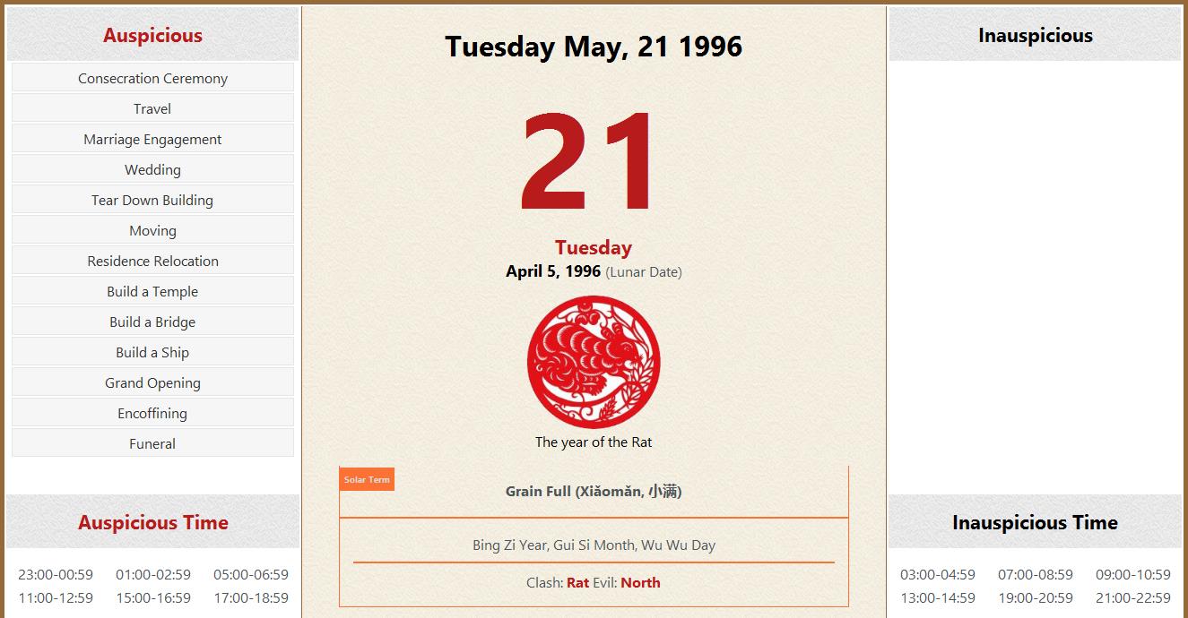May 21 1996 Almanac Calendar: Auspicious/Inauspicious Events and Time