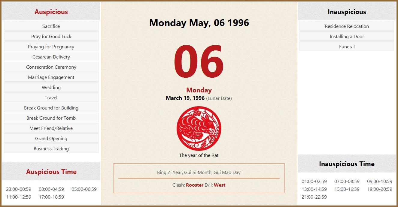 May 06 1996 Almanac Calendar: Auspicious/Inauspicious Events and Time