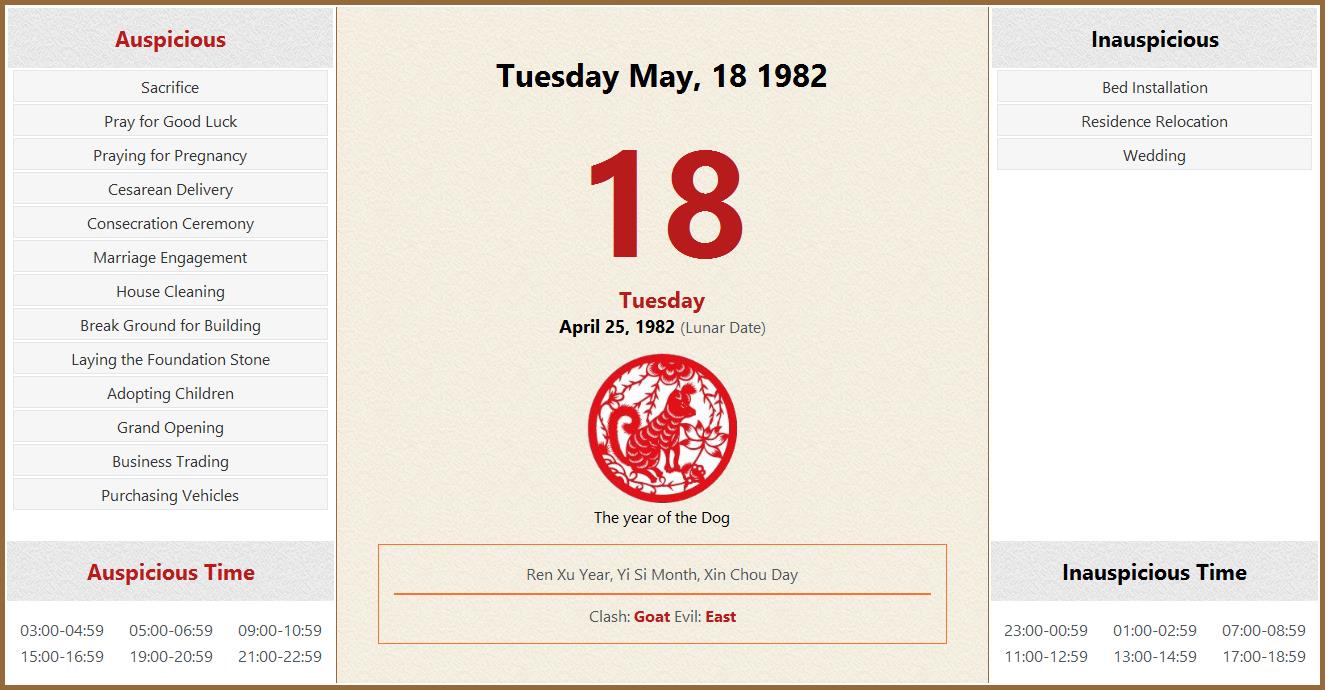 May 18 1982 Almanac Calendar: Auspicious/Inauspicious Events and Time