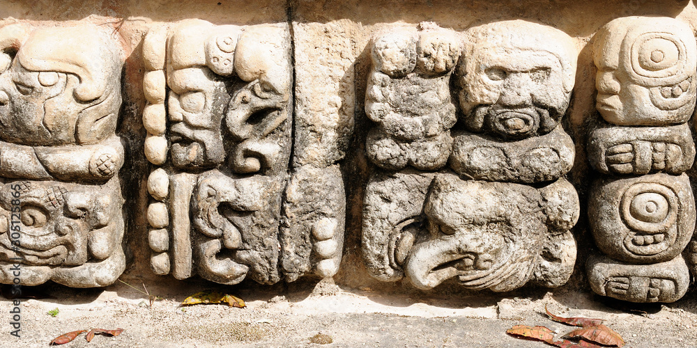 Stone skull and statues on the wall of pyramid in Copan Honduras Stock