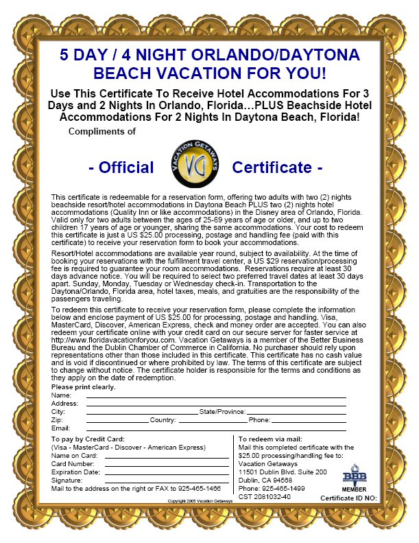 VacationGetawayIncentives com 3 Day 2 Night Vacation Certificate
