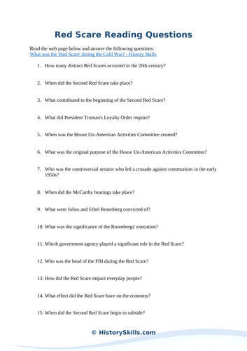 The Second Red Scare Reading Questions Worksheet Teaching Resources