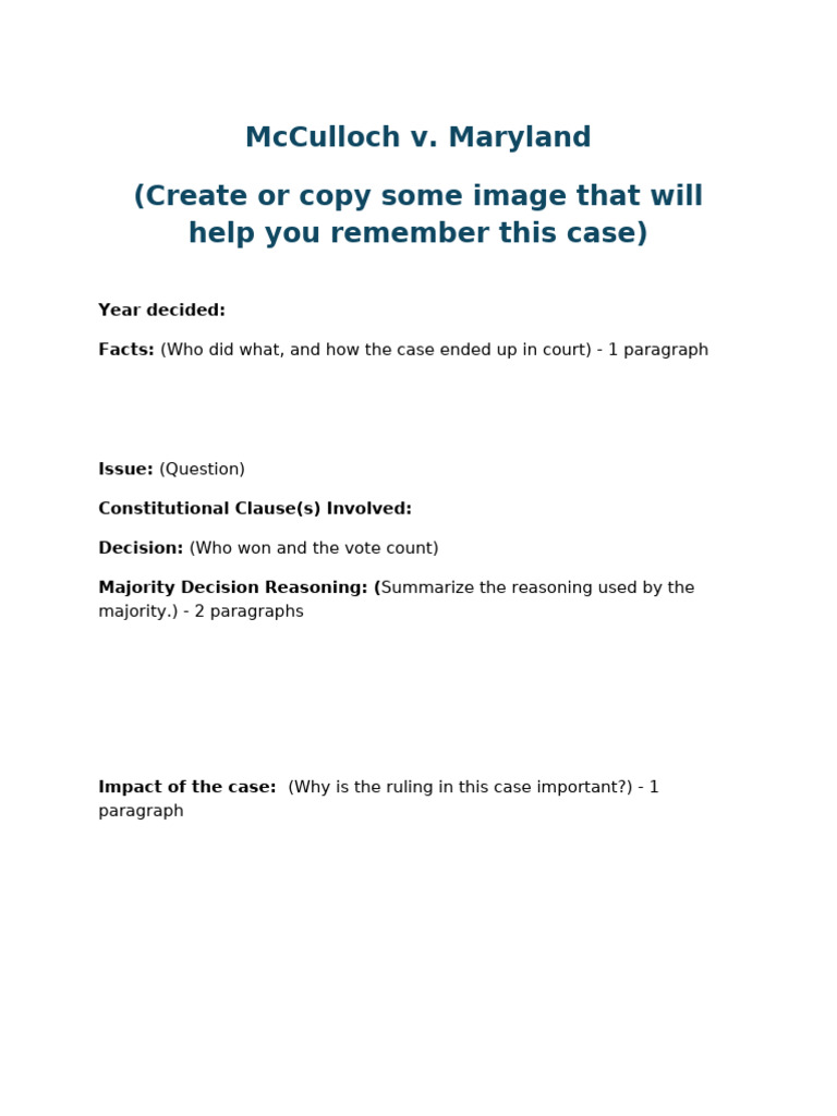 McCulloch Case Sheet BLANK docx Required Supreme Court Case McCulloch