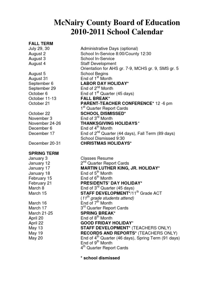 Mcnairy County Board of Education 2010 2011 School Calendar: Grade