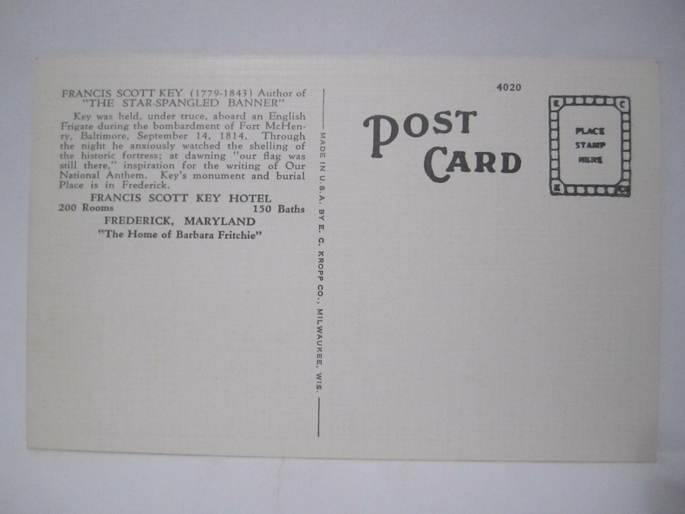 FRANCIS SCOTT KEY HOTEL GRAVE MONUMENT POSTCARD FREDERICK MD MARYLAND
