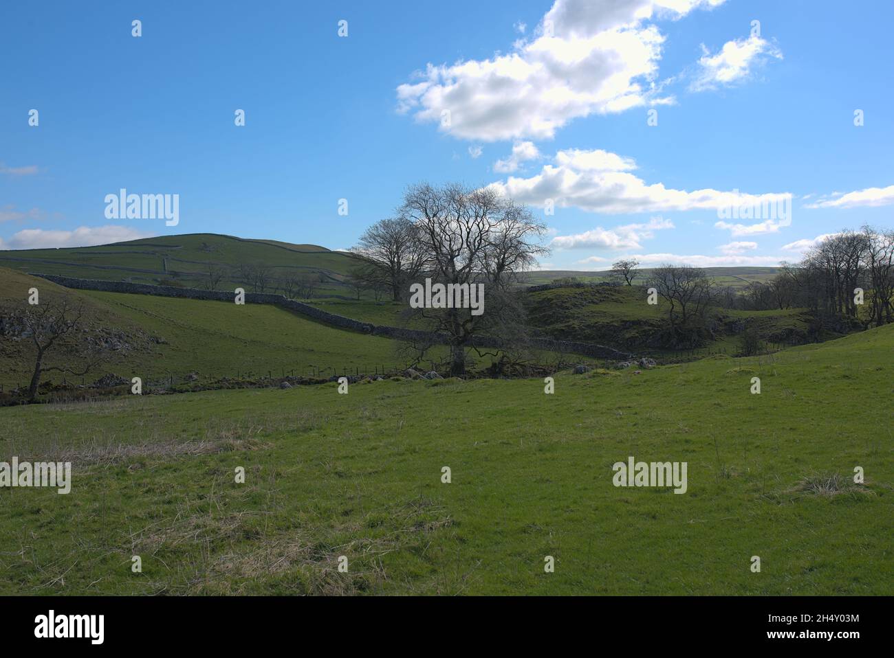 Green meadow on the hills with trees and the clue sky with clouds in