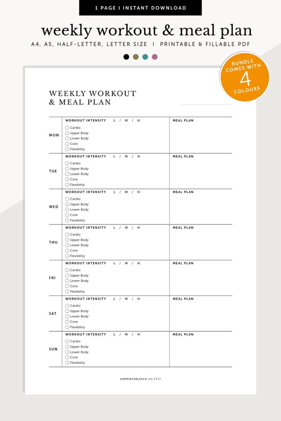 Weekly Workout and Meal Planner Weekly Health Planner Fitness and