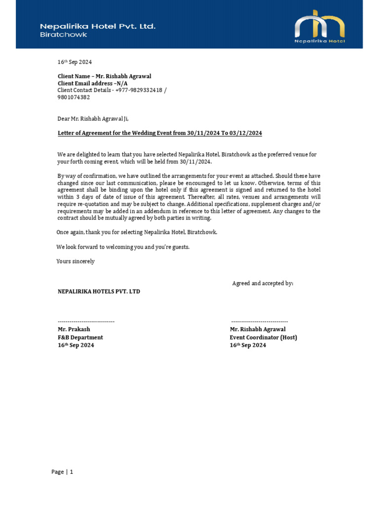 Rishabh Agrawal Letter of Wedding Contract 01st Dec 2024 PDF Meal