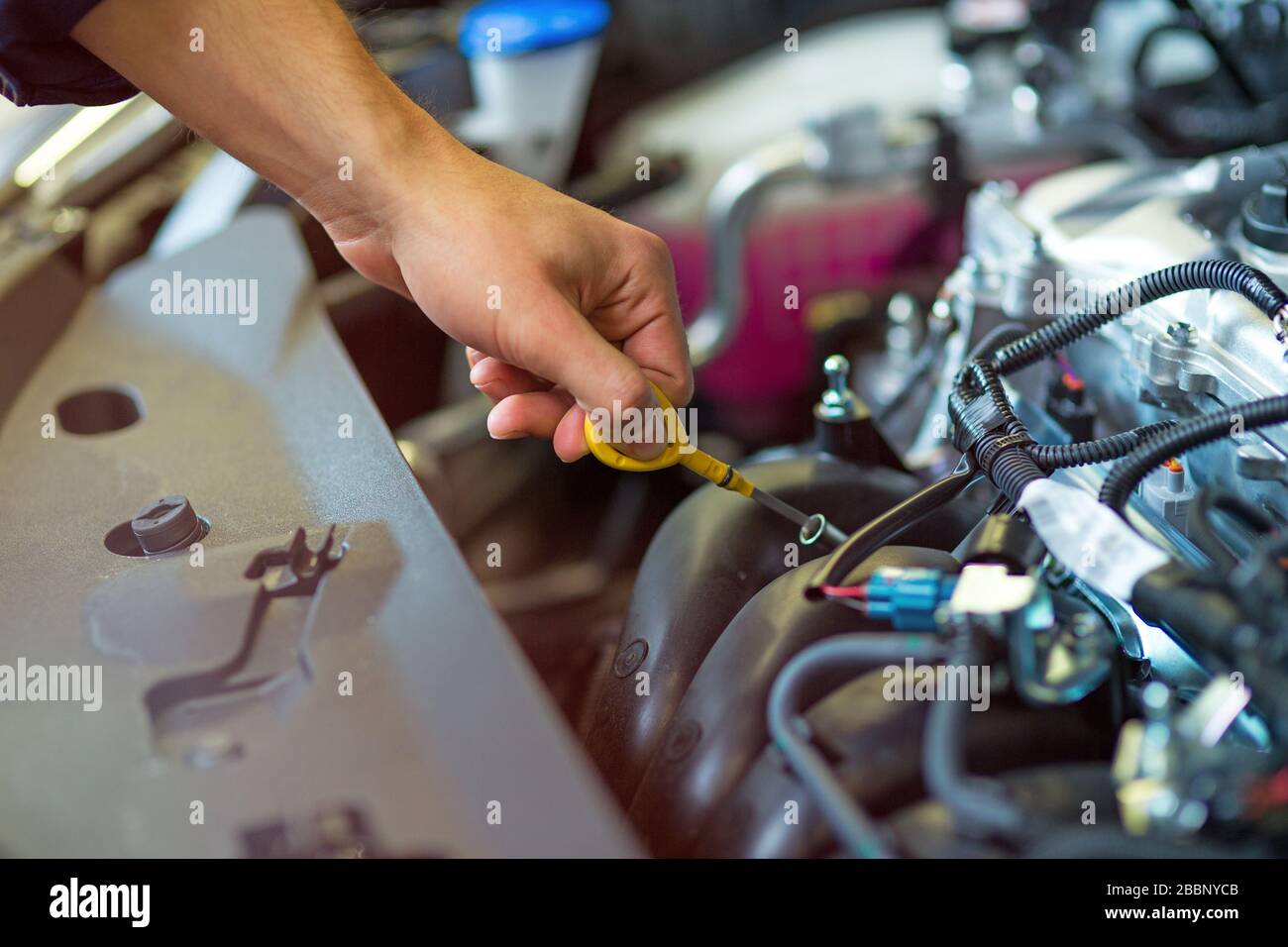 Portrait of an auto mechanic putting oil in a car engine Stock Photo