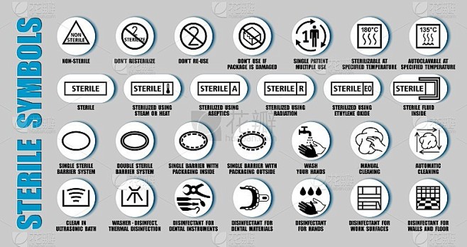 医疗器械包装使用ISO、FDA图标的全套消毒和消毒符号。清洗药品设备包装象形图