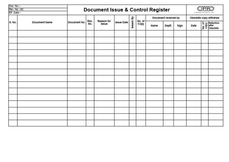 CONSTRUCTION MANAGER: Document control and Correspondance Document Register