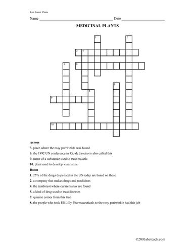 Crossword: Rain Forest: Plants Medicinal (upper elem/middle