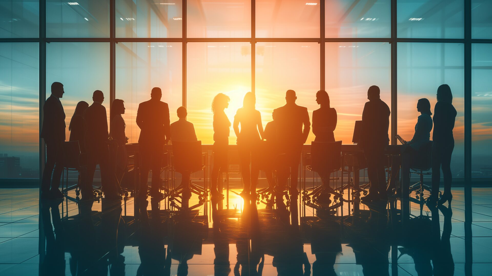 Silhouette of a group of people in a meeting overlooking a city skyline