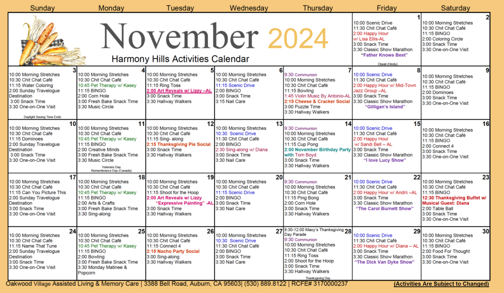 Memory Care Activity Calendar at SpringBrook Assisted Living