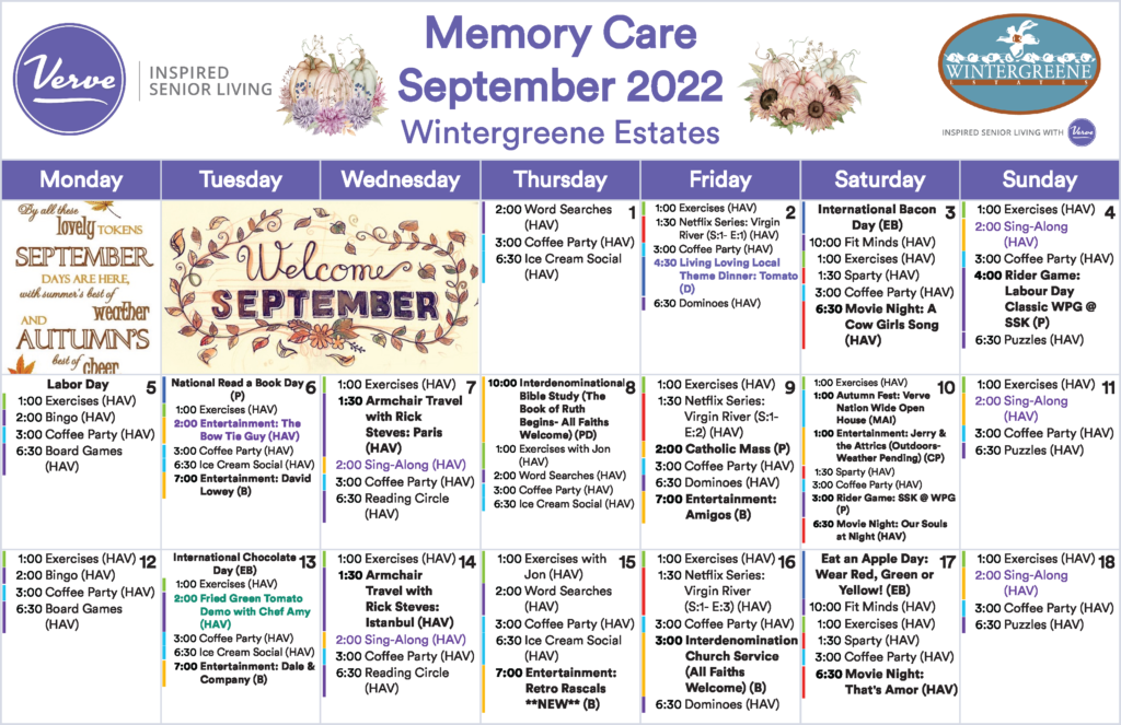 September 2022 Calendar Memory Care Wintergreene Estates Retirement