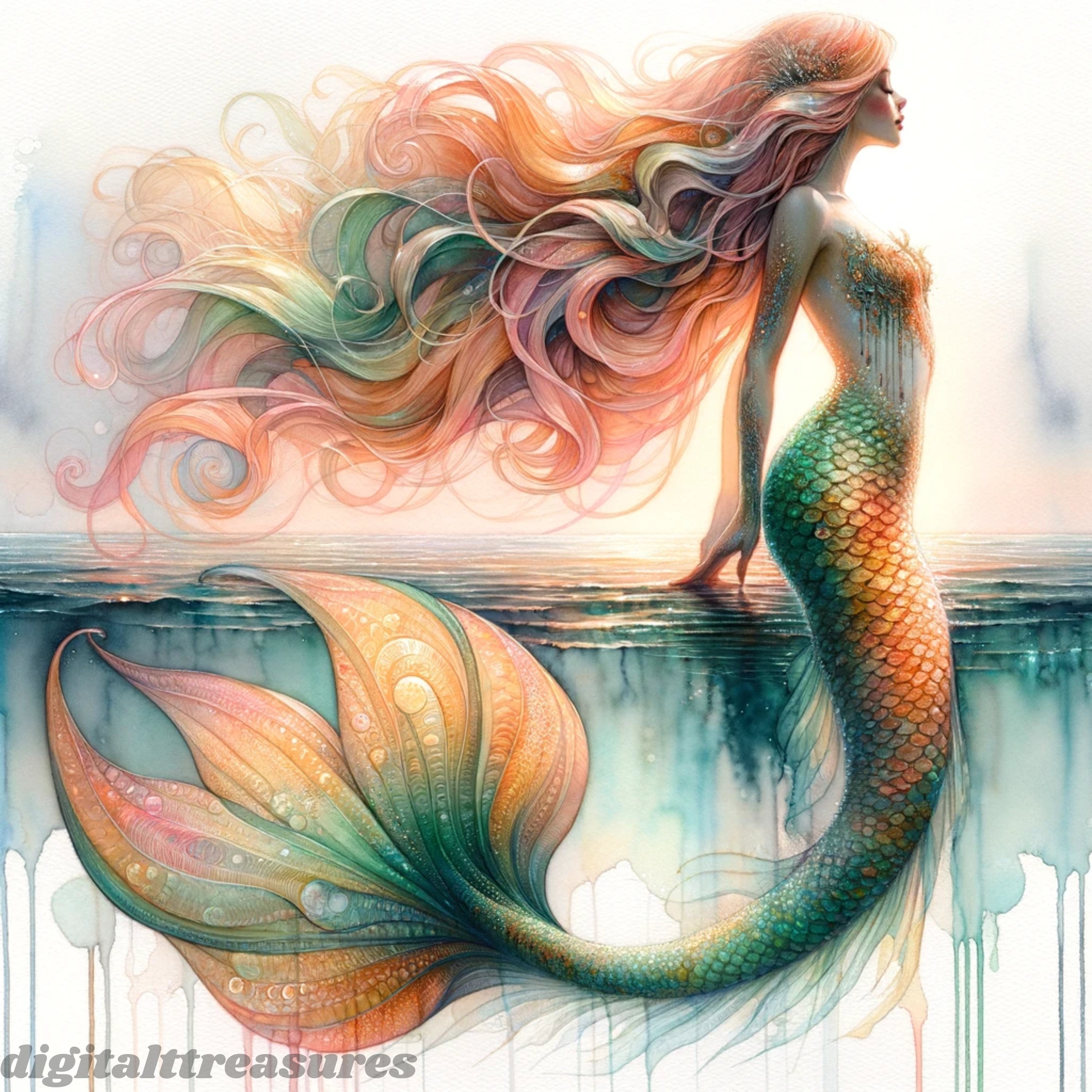 Digital Download Beautiful Mermaid With Tail in Sea Long Hair