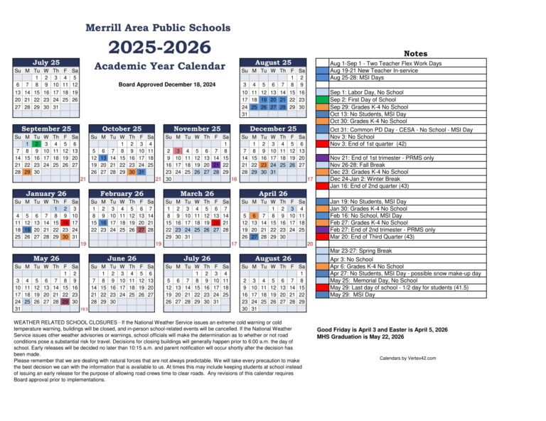Merrill Area Public Schools WI Calendar 25 26 Revised PDF EduCounty