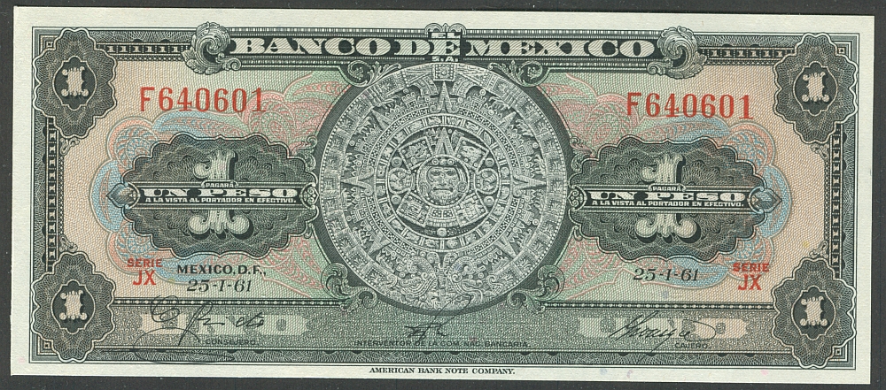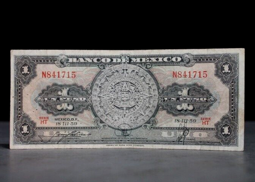 MEXICO 1 Peso BANKNOTE 1959 AZTEC CALENDAR Mexican Currency Paper Money
