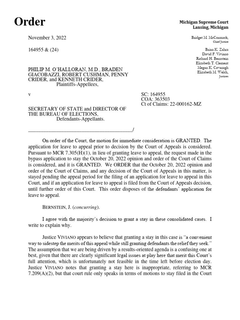 MI Supreme Court RE: Poll Challenger Guidance PDF