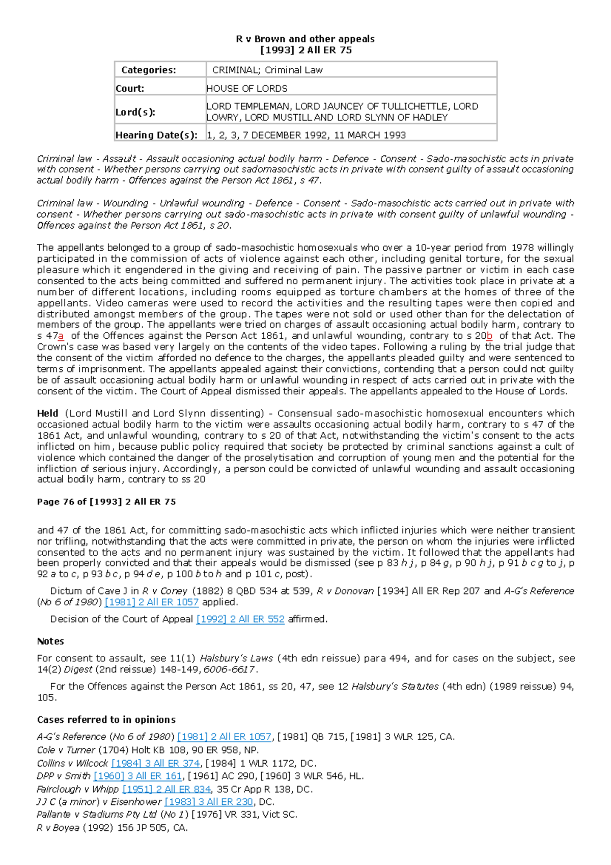R v Brown and other appeals 1993 2 All ER 75 Criminal law