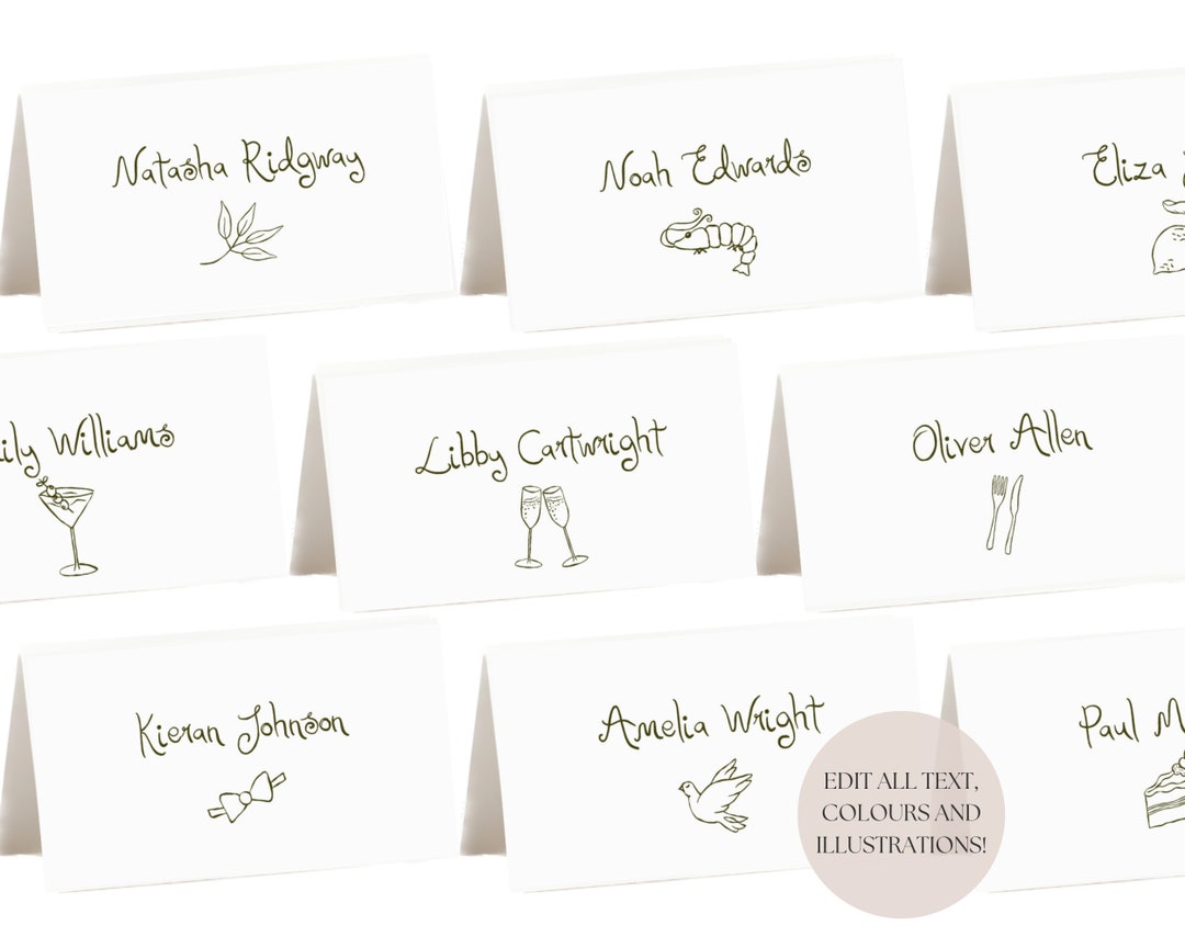 Place Cards Template Handwritten Hand Drawn Doodle Illustrations Fun