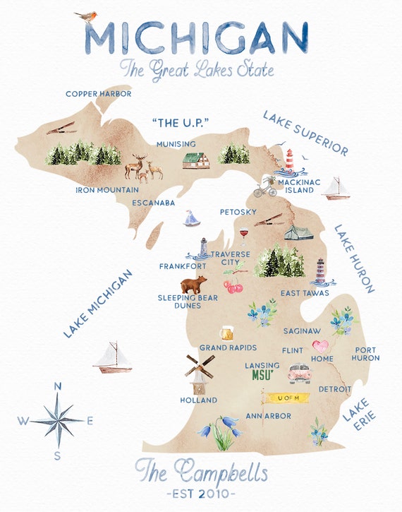 11x 14 Michigan Map Watercolor Print Personalized Etsy
