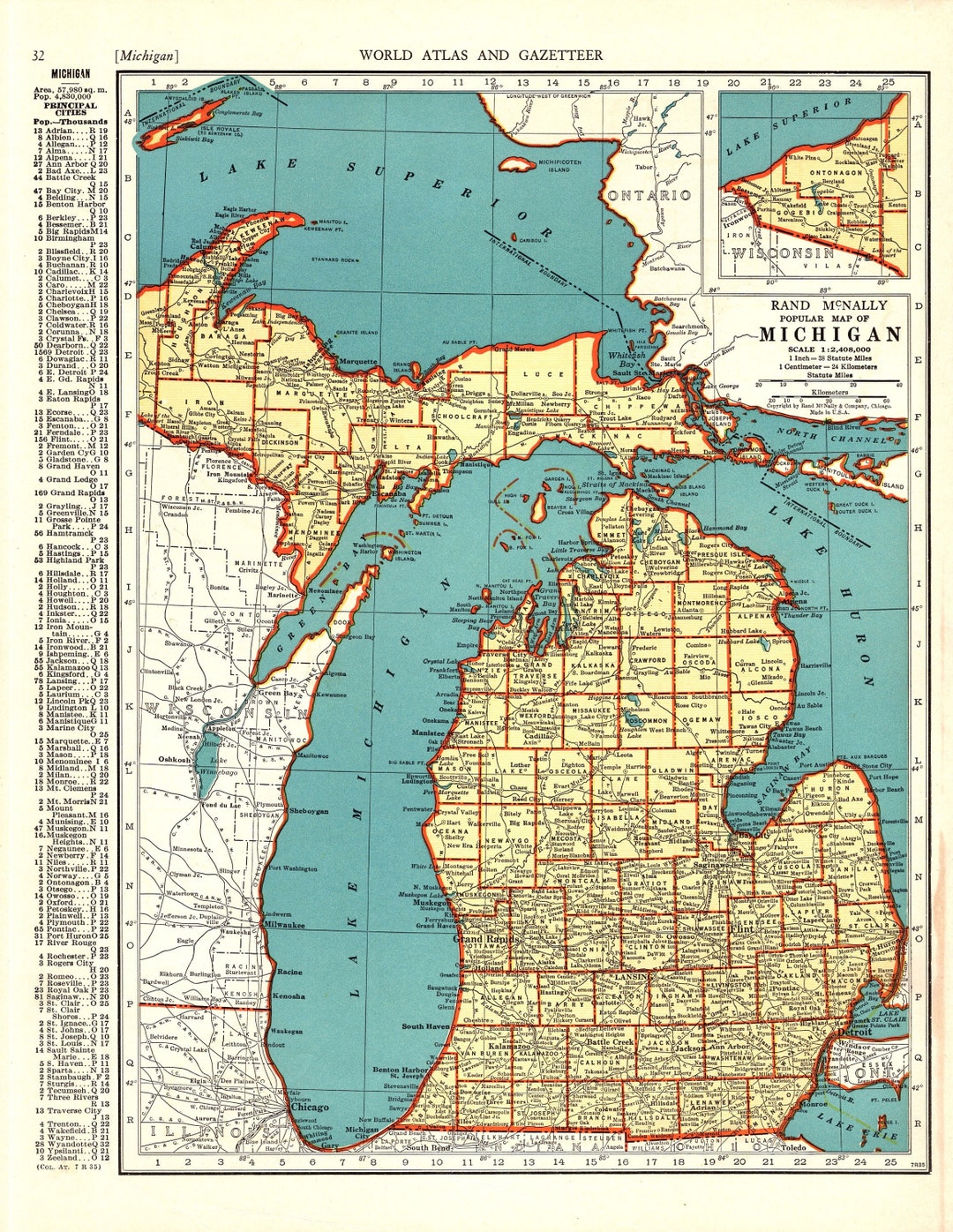 1937 Antique MICHIGAN State MAP Vintage Map of Michigan Gallery Wall