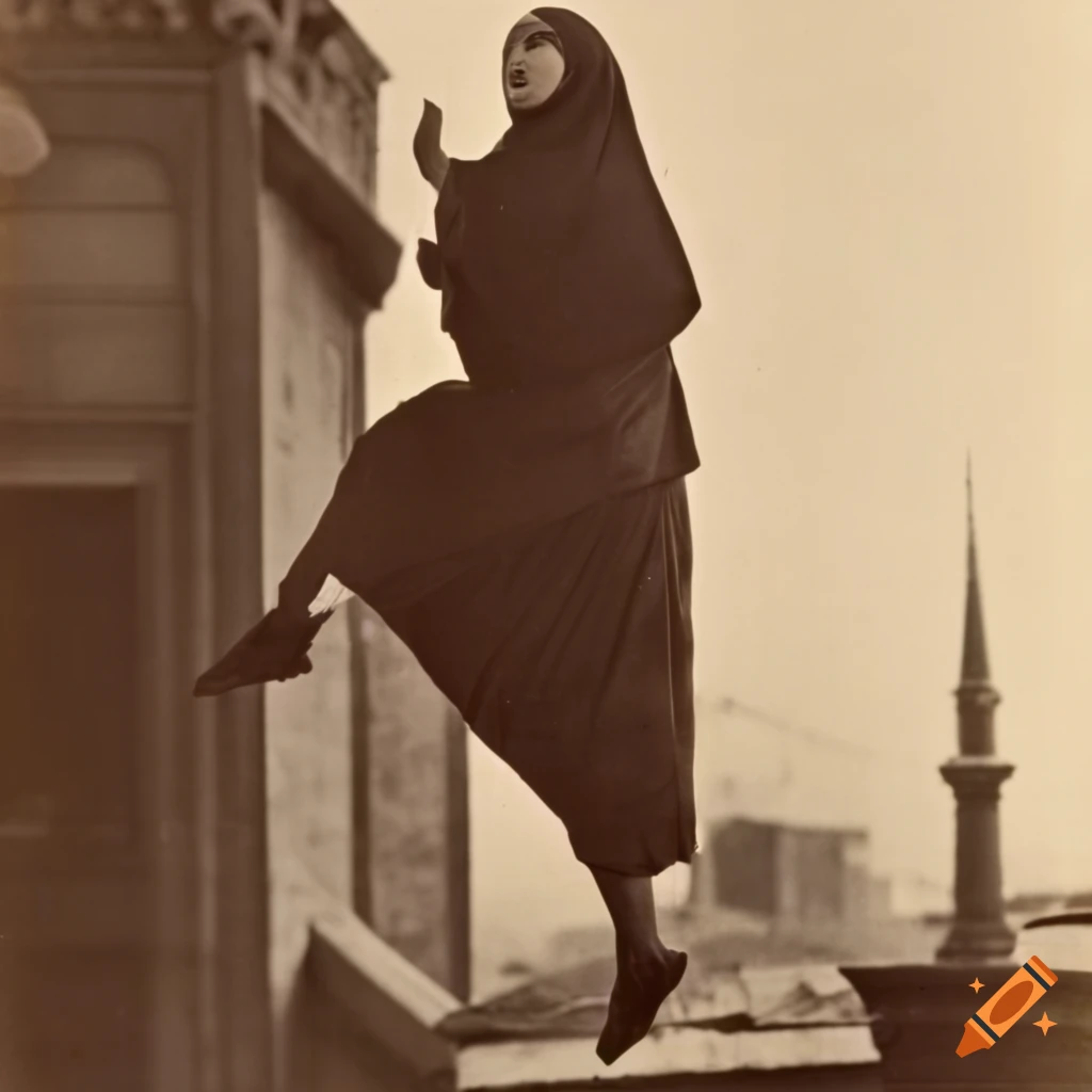 Persian woman in chador hijab jumping from rooftop overlooking Middle