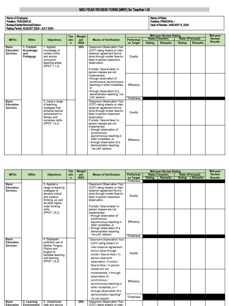 MID YEAR REVIEW FORM (MRF) For Teacher I III 2022 2023 Template Dotx